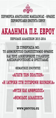 Ξεκινά τη Δευτέρα, 21 Μαρτίου 2016, ο νέος κύκλος διαλέξεων της ΑΚΑΔΗΜΙΑΣ Π.Ε. ΕΒΡΟΥ υπό τον τίτλο «ΘΕΜΙΔΟΣ ΔΙΑΛΕΞΕΙΣ» που πραγματοποιεί η Περιφέρεια Ανατολικής Μακεδονίας Θράκης – Περιφερειακή Ενότητα Έβρου σε συνεργασία με τους Δικηγορικούς Συλλόγους Αλεξανδρούπολης και Ορεστιάδας.