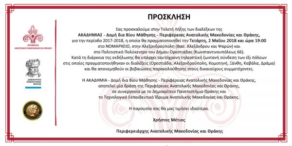 Σας γνωρίζουμε ότι την Τετάρτη 2 Μαΐου 2018 και ώρα 19:00, θα πραγματοποιηθεί η Τελετή Λήξης των διαλέξεων της ΑΚΑΔΗΜΙΑΣ - Δομής δια Βίου Μάθησης - Περιφέρειας Ανατολικής Μακεδονίας και Θράκης, για την περίοδο 2017-2018, στο ΝΟΜΑΡΧΕΙΟ στην Αλεξανδρούπολη και στο Πολιτιστικό Πολύκεντρο Δήμου Ορεστιάδας.